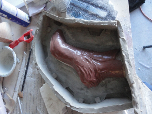 After you’ve removed the clay, build another 2-4 inch thick vertical wall around the other half of the stone mold, and put in-this is very important- pry points. These are little holes that will be in the mold along the mold line that help you to open the mold. We did not do these on our first foot mold, but luckily the broken out keys helped us to open it up. Just make little rectangles of clay, just thick enough to get a screwdriver into, and press them along the edge of the wall, as you can see above. The pry points are those little square pieces you see. Make sure to put a pry point at the top of your stone middle piece, too! It makes it a lot easier to take out.