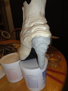 In this post I’m going to discuss the little things that didn’t really have enough content for a post in itself. One of these items are the heels of the shoes. The first thing I did for the feet after we cast the shoe covers in foam latex, is trim the excess foam off, and have Mario make the seams disappear- we’ll cover seaming shortly. Then, I glued the covers to the shoe using the same rubber cement we used to make the paint. After that, I grabbed some two part epoxy clay (we used Magic Sculpt) and sculpted out the heels.