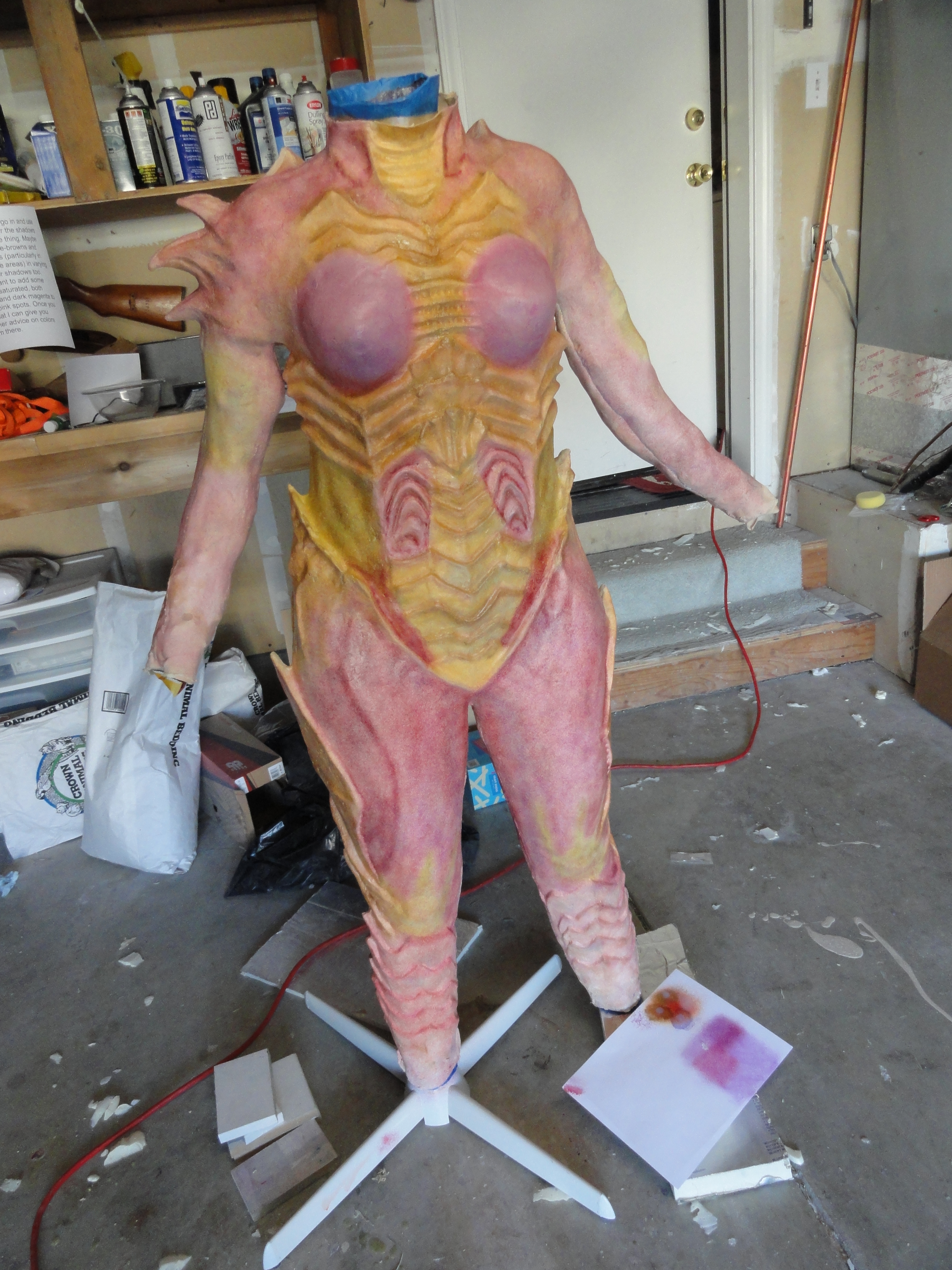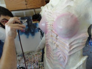 After the pinks were applied we started using burnt umber to add the brown hues to the armor plates that make up a large portion of her body form. This was a slow process that took the better part of a day.  The paint will also stick to its self until it is completely dried and even then you may need to apply talc powder to remove the adhesive property.