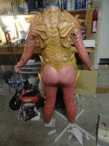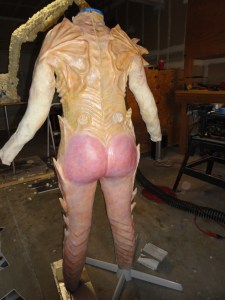 Once we started to add the greens and dark browns in to the ribs and legs we realized that we may pull this off yet. The green biceps were always a point of worry due to the fact that they would move when Alice had the suit on and may not line up in the correct anatomical spot.