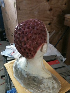 Next, the cowl. As I’ve said before, I did not sculpt the hairline on the cowl far enough down on the face because I didn’t account for how much it would be pulled back with the weight and volume of the dreads. To attach the dreads, I made sure there were spots all over the cowl to make the dreads look like they were coming out of the cowl. Then I marked them, to help me count them but also color coded them so that I would know what size dread to put in each hole. After that, we colored the scalp part of the cowl so that the dreads would blend in better, we made it kind of a purple color.