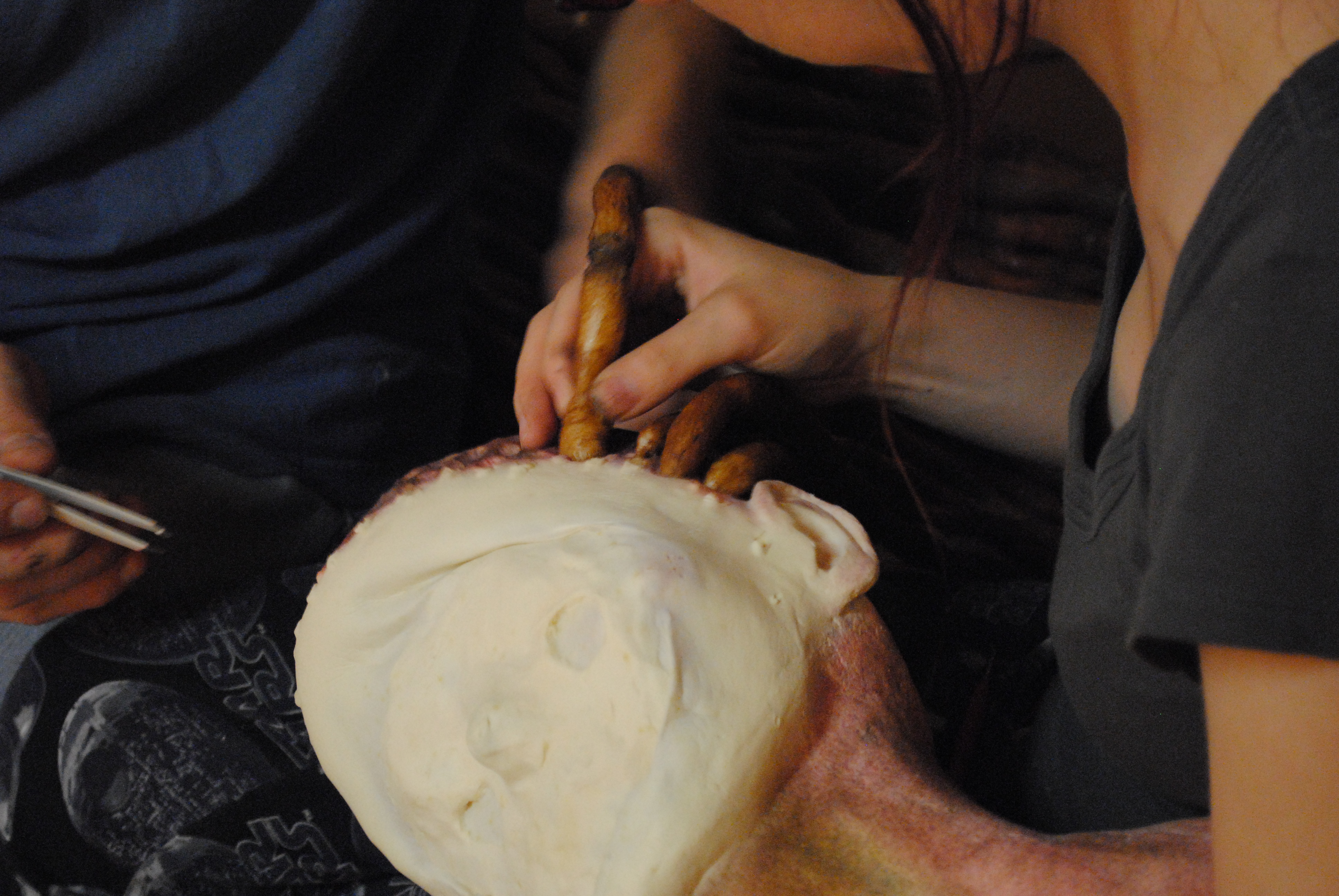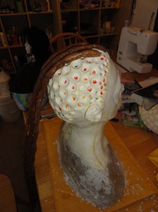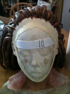 Also for the cowl, to make it easier to put on my head and also because we were going to use it more than once, I cut up the back of the neck (it was reinforced with cloth when we cast it in foam latex) and then sew clasps up the cut so that it would be closed easily. To attach the dreads, we put a rounded shaped piece of foam inside the cowl (we used a kid’s foam hat that we cut the excess off from Michael’s, I have a small head so it fit perfectly inside the cowl), cut holes where each dread would come through, then carefully pull each dread through both the cowl hole and the inside foam hole, pulling it in from the outside, if that makes sense.