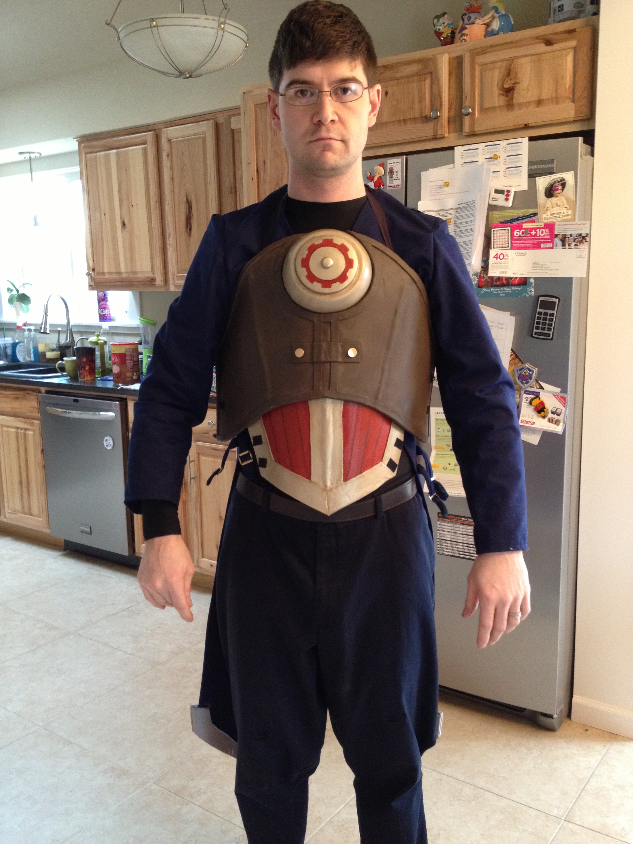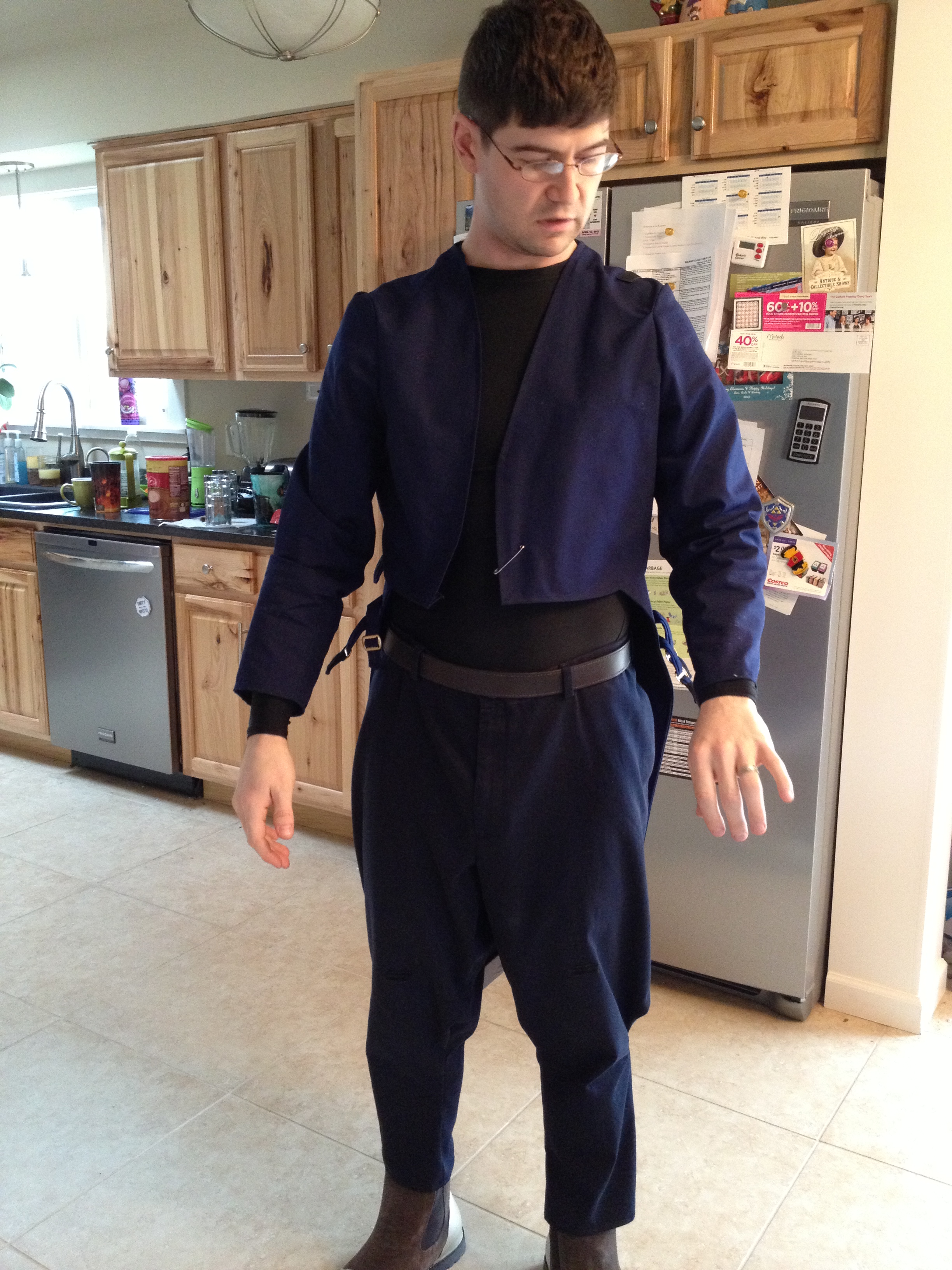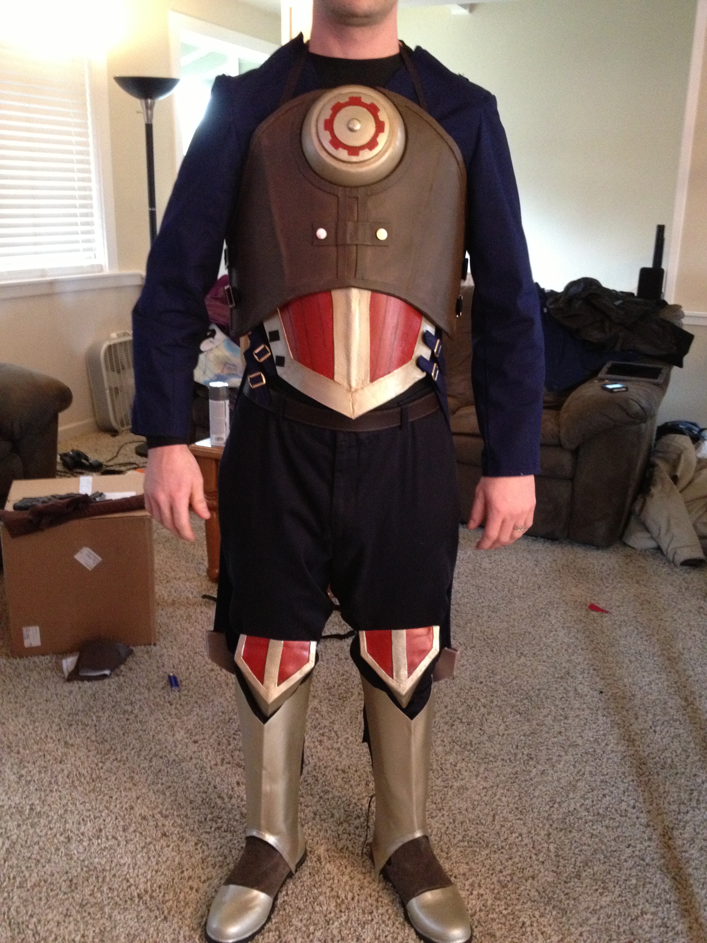 Here’s Jayce, he’s a pretty cool guy, but he’s got a lot going on. He’s got knee armor, gloves, greaves, a coat, some chest…thing? and this collar that stands up in a way collars really shouldn’t. I’d show you my terrible drawings breaking it down, but I’m not sure you’d be able to really make heads or tails of them, so here’s how we broke down the costume into layers, and the order we put them on!