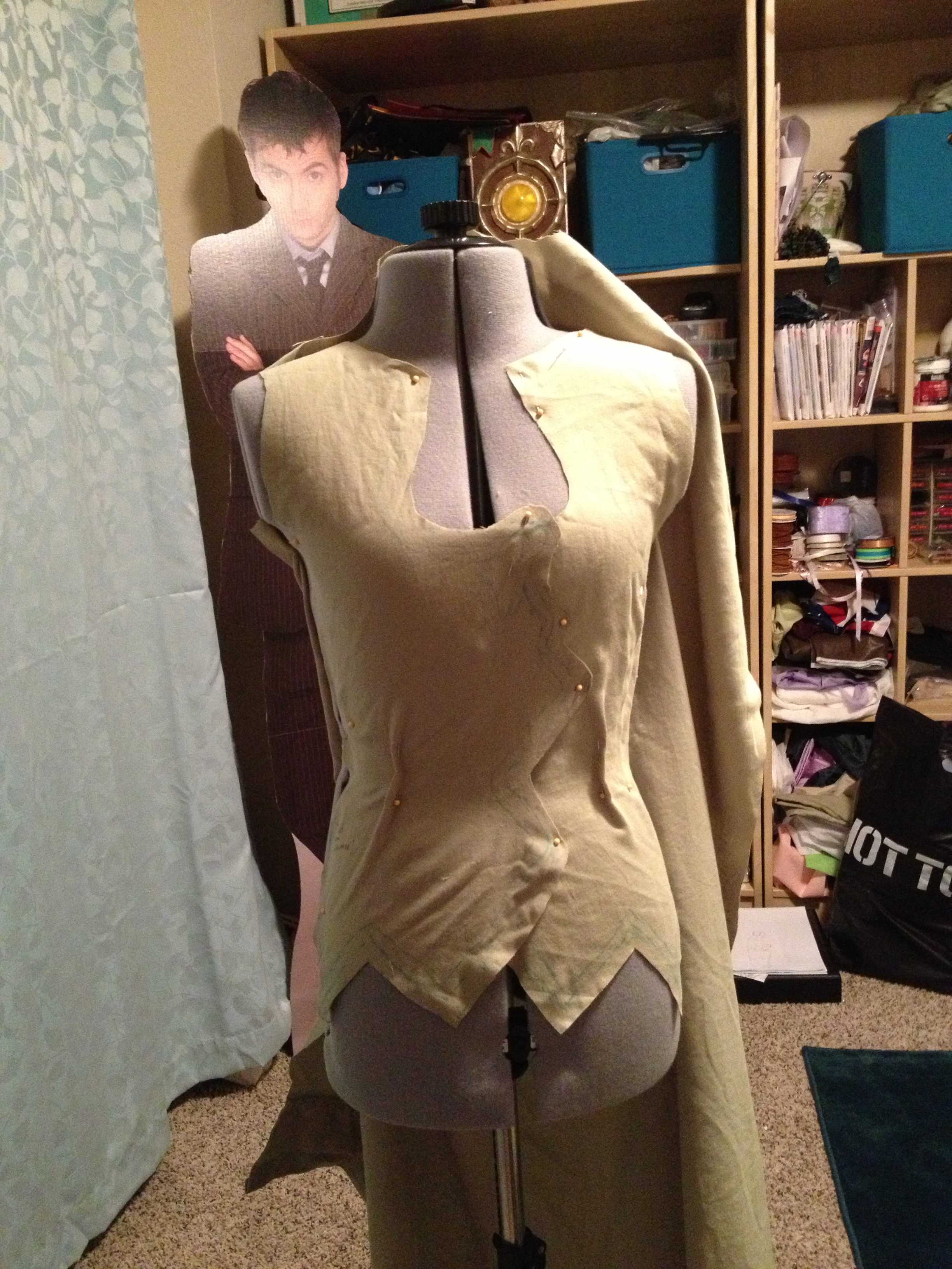 As you can see here, I used some spare fabric I had, and then drew and cut out the shape of the costume, leaving room for hems and seams. This is important, though: if your body is not exactly the same size as your dress form, then make sure to try on your pattern before you start sewing. My issue is I’m pear shaped and I can get the top of the dress form OR the bottom of the dress form to match my measurements, but never both. So, I had to try on the pattern and get Mario to trace how it SHOULD lay because if I just drew out the back of the costume on the dress form as it was, it would look way too small and really strange. Believe me, I’m speaking from experience, but I won’t subject you guys to that terrible photo. Just take my word for it