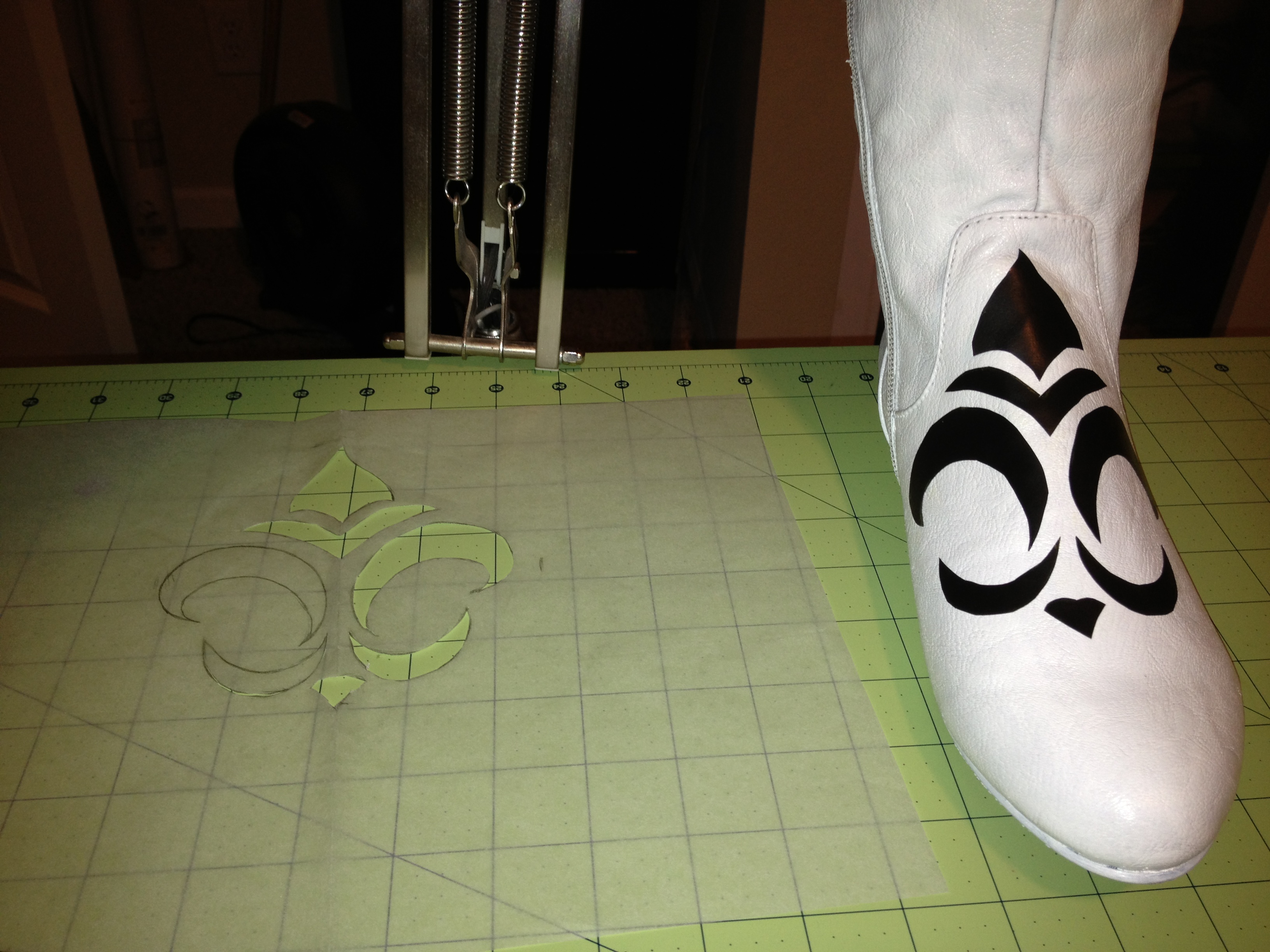 Using the pattern Sarah drew for the boots, I cut out the same pattern out of sticky stencil paper and traced it onto the boot with a paint pen.