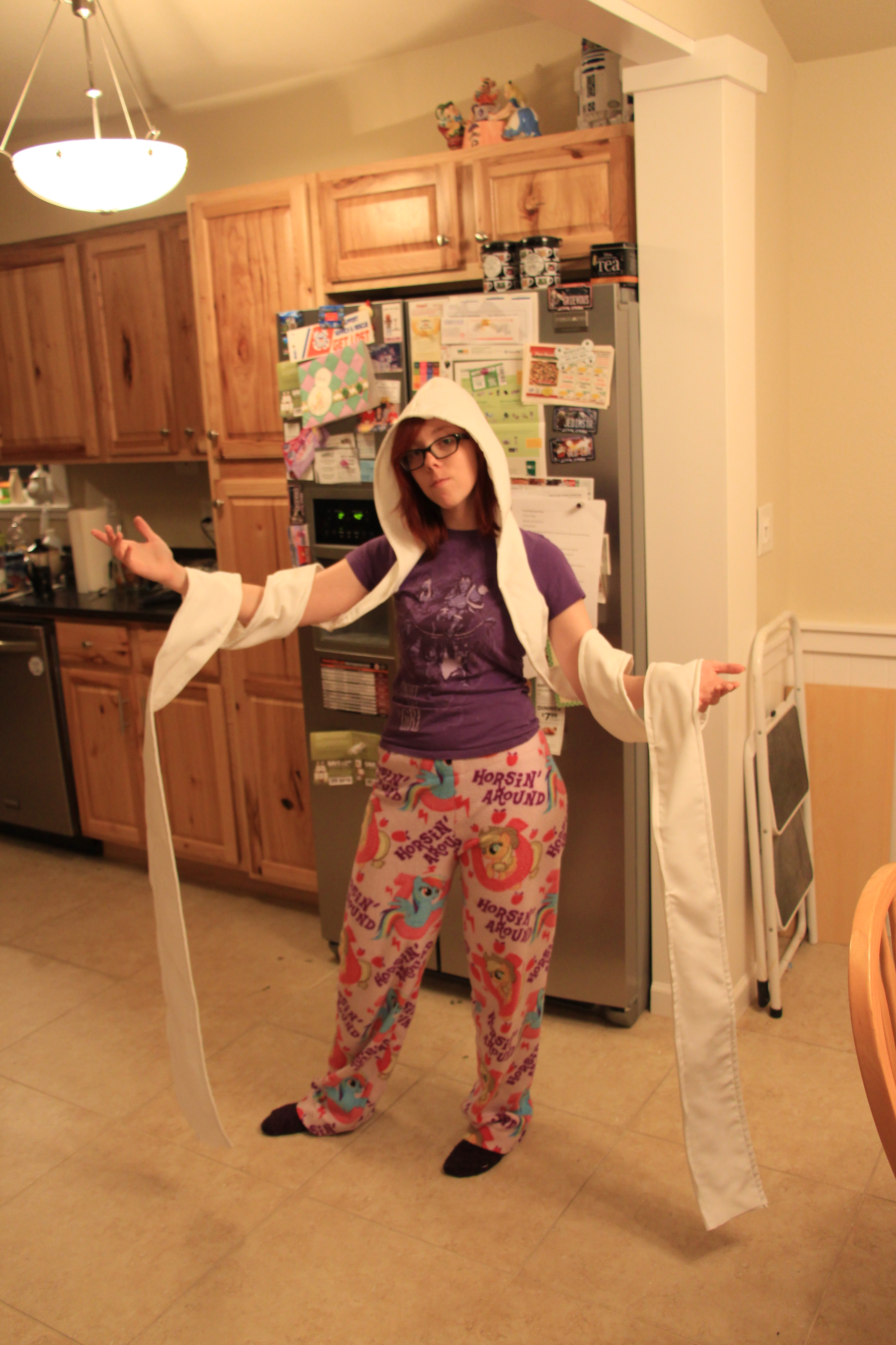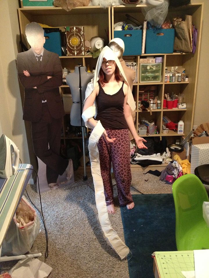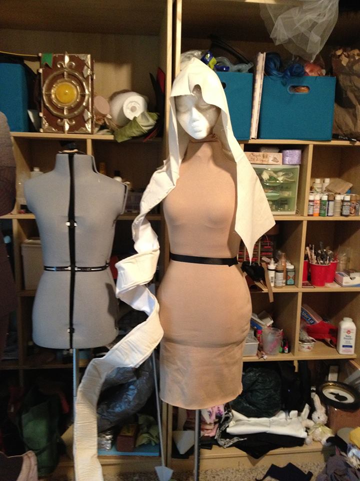 1375007_10151663227773931_2084022753_nOh my gosh. The hood/flowy arm things. This was easily the most difficult part of this costume, I wanted it to be as seamless as possible so I did it in two long pieces. What you see above was the practice with the pattern, and with wire all the way down it. I later decided to only put wire on the parts that wrapped around my arms, since the wire is really hard to control and it can look really wonky if it’s too long.