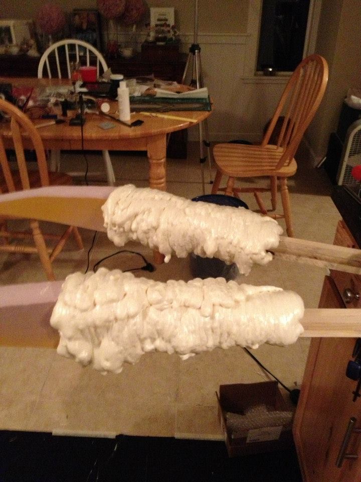 And to cover the worbla and give it a lot more shape and depth, we covered it in foam and shaped out the tips of the wings.