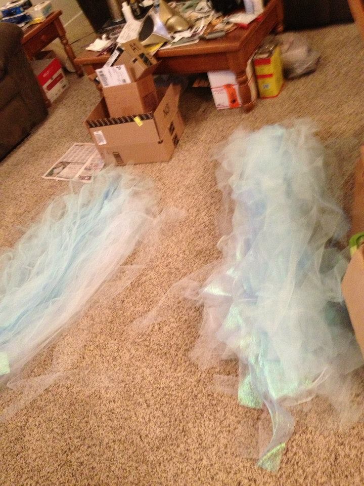IMG_6753So, yes. Wings. These have a skeleton of wood, actually, with worbla covering them, but first Mario did some electrical stuff and attached LED strips to the underside of the wood, where it’d be shining down on the wings, and we made it so that the wiring would be able to connect and disconnect from the wiring in the chest plate. We used a little push button so I didn’t have to do much to turn it on and off, and put it in the top of the chest plate. Then, (after a wonderful friend helped cut like 30 yards of tulle) I stapled three different shades of tulle (white, light blue, and a opalescent blue/purple onto the wood on either side so that it flowed down on either side of the LED strip. (We used this strip, by the way.) Then we put a cover of worbla over top of that!