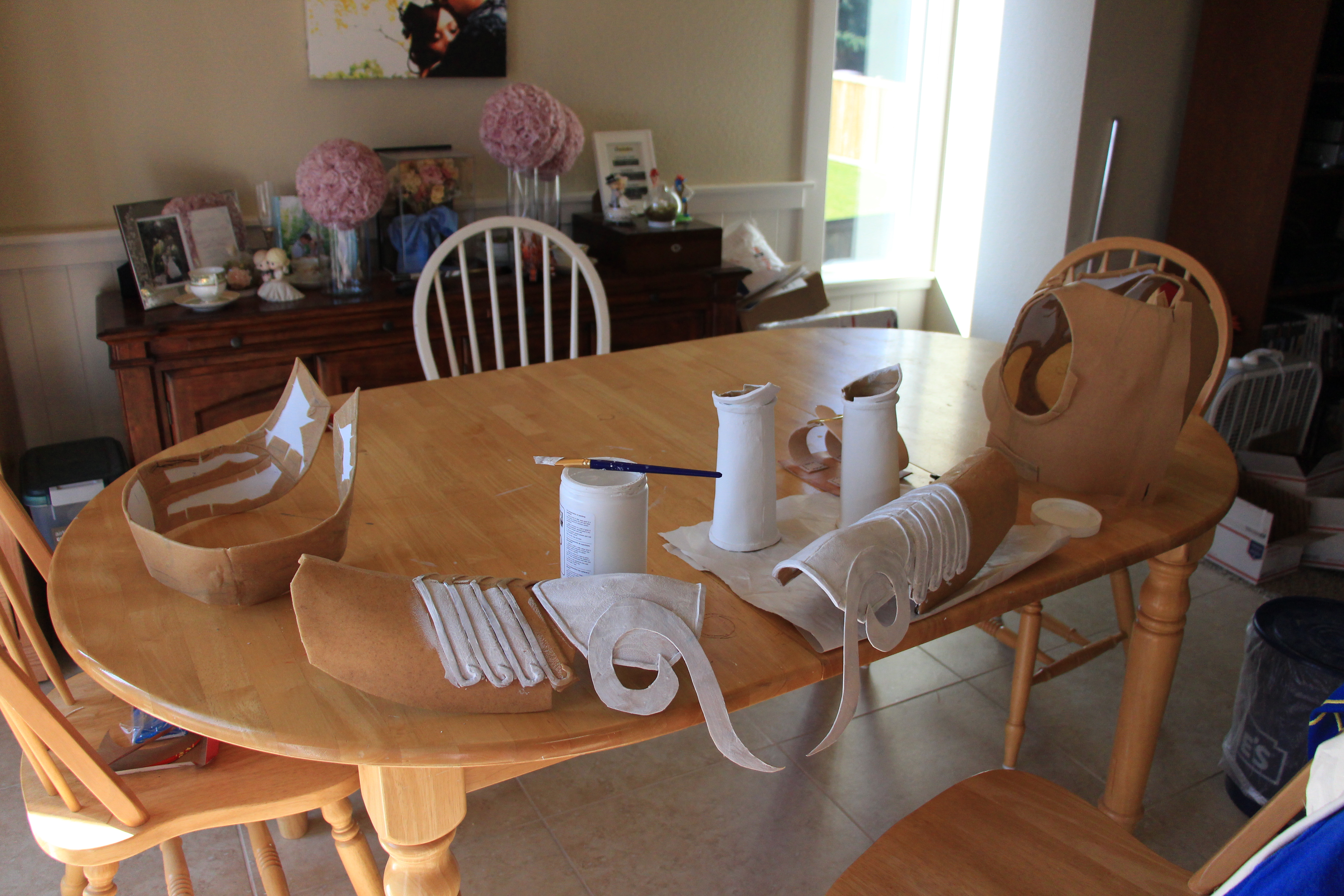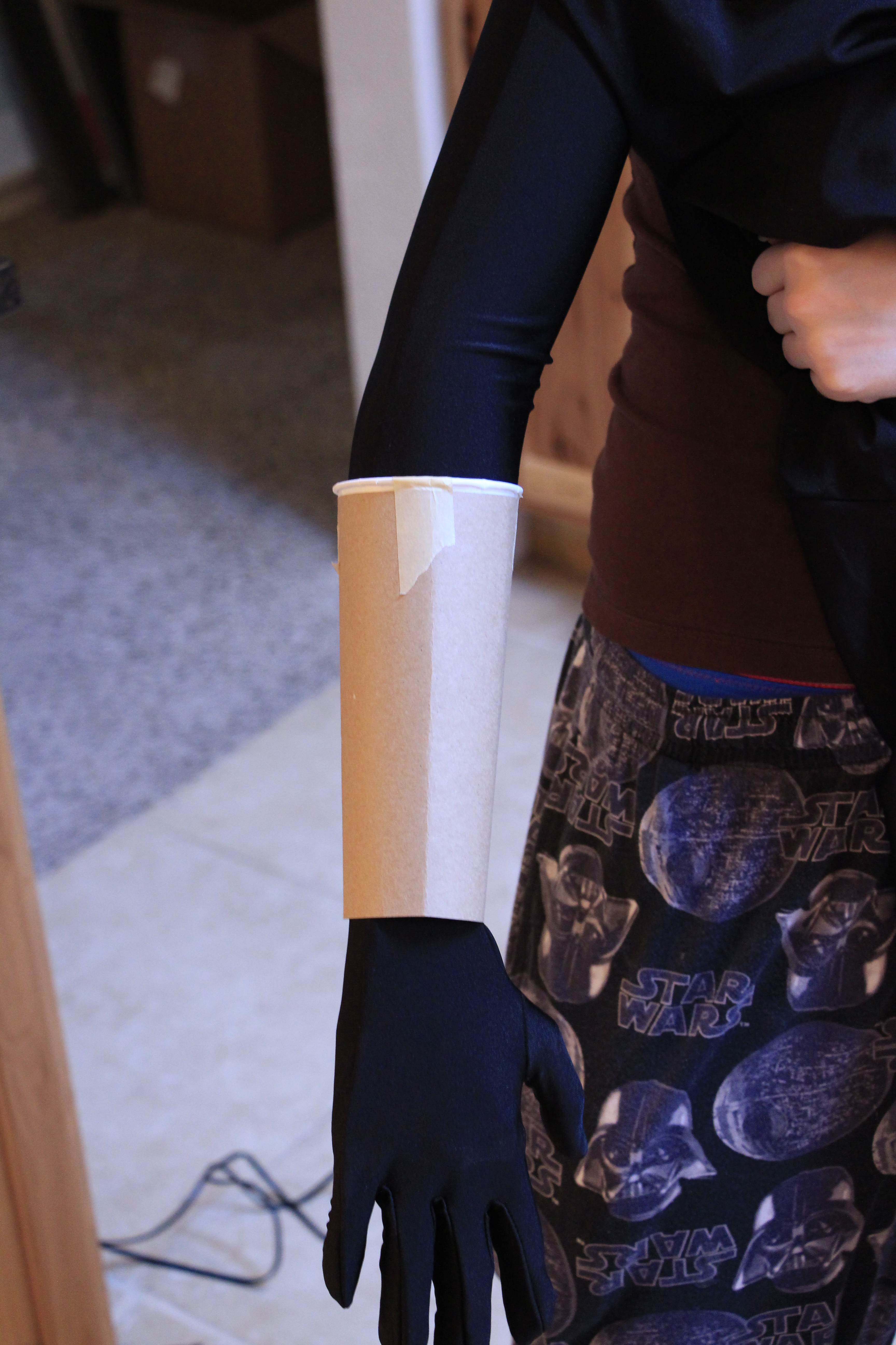 IMG_5934I have tiny wrists, so we used a paper cup to make the template for the bracers. We just kept cutting it further up until I could fit my hand in comfortably.