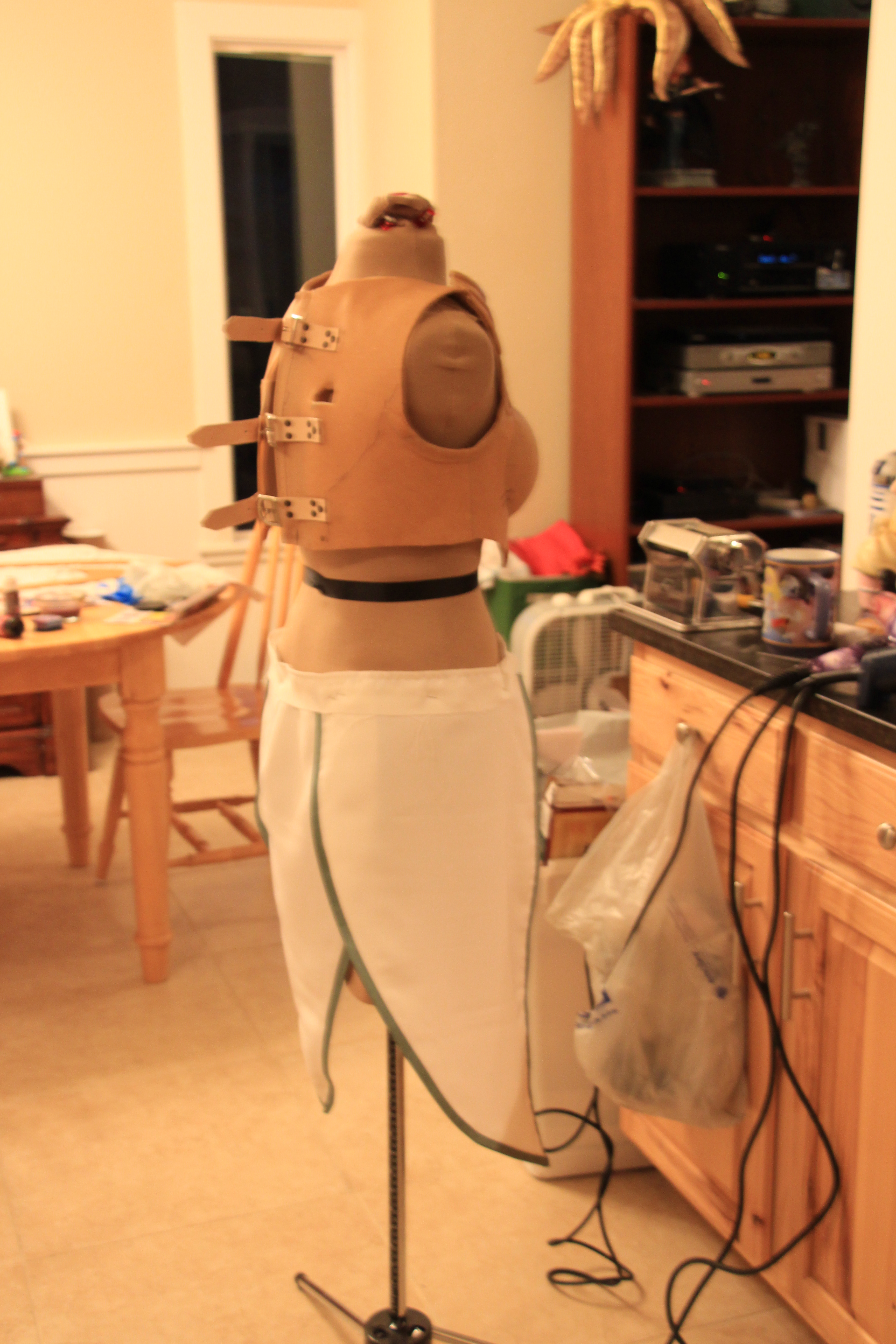 I think that’s it? The corset was glued onto the chest piece, and had snaps attached to it that the belt attached to (not that good of a plan, the snaps would come undone if I tried to bend at the waist). I glued the skirt onto the belt. The shoulders are held on by a strip of velcro that is attached to the underside of the shoulder and goes around the top of the shoulder on the chest piece.