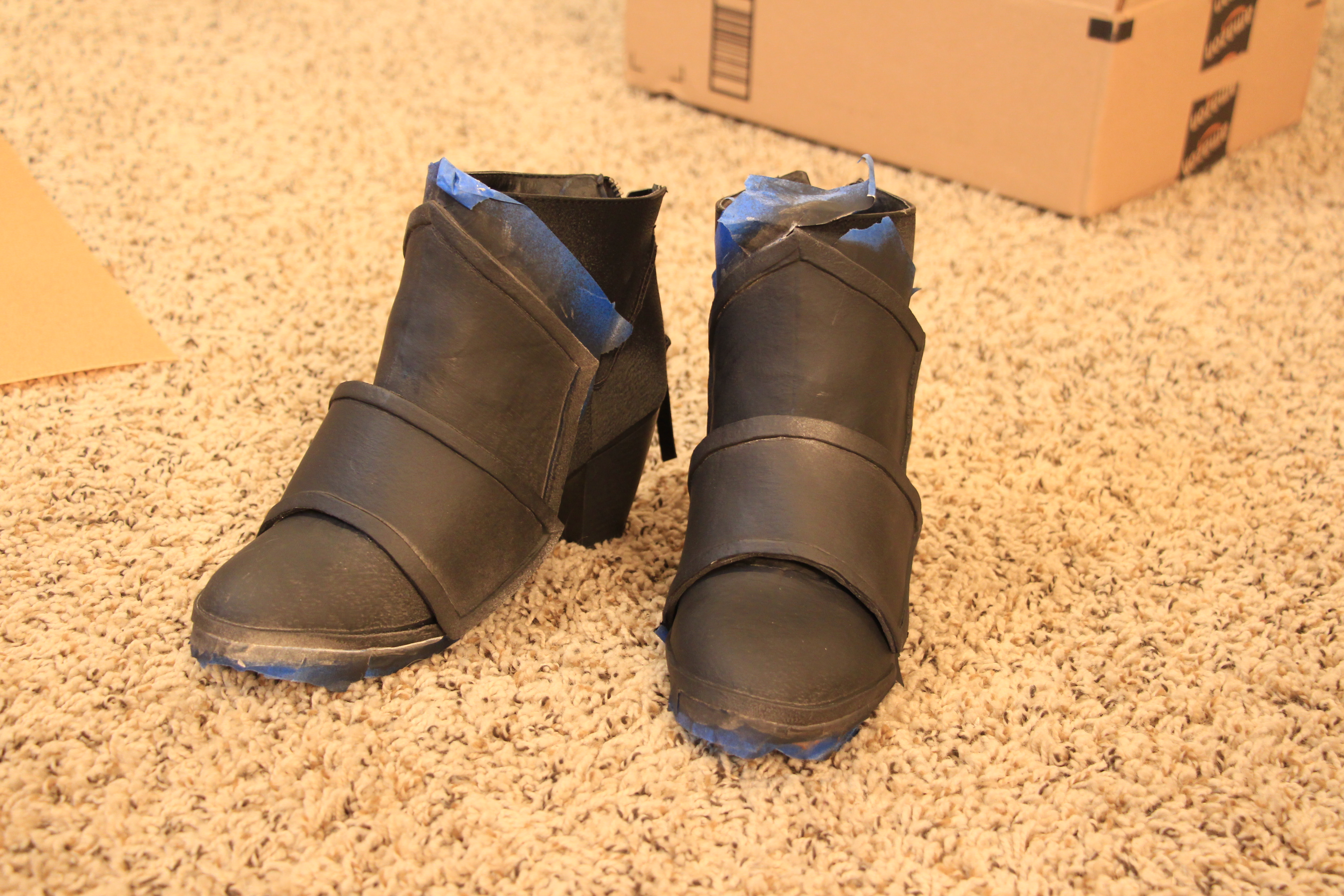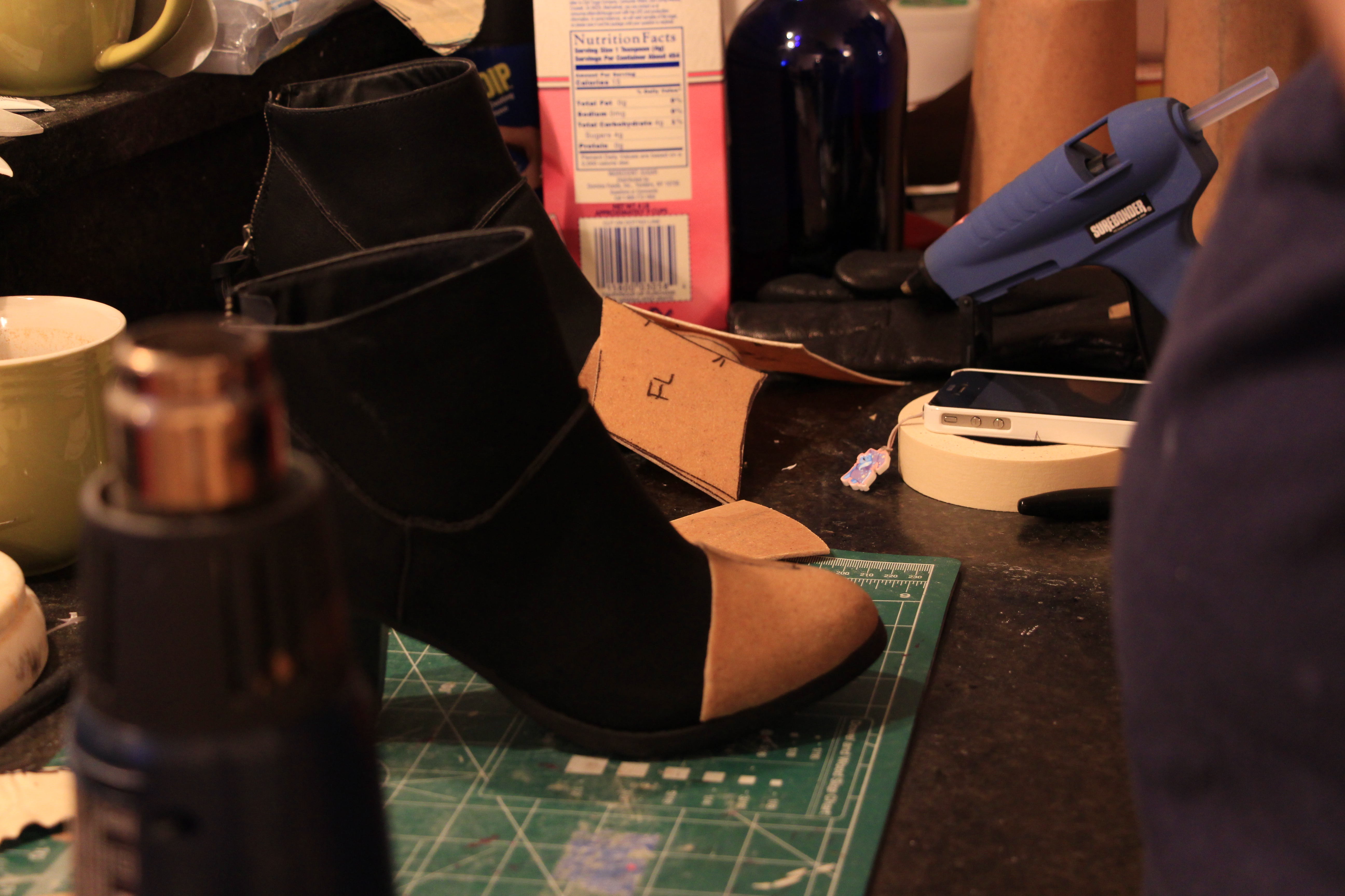 IMG_6454For the shoes, I wanted three layers of worbla, with the middle layer being on top of the other two. They were glued on, but also tied underneath the shoes to be sure.