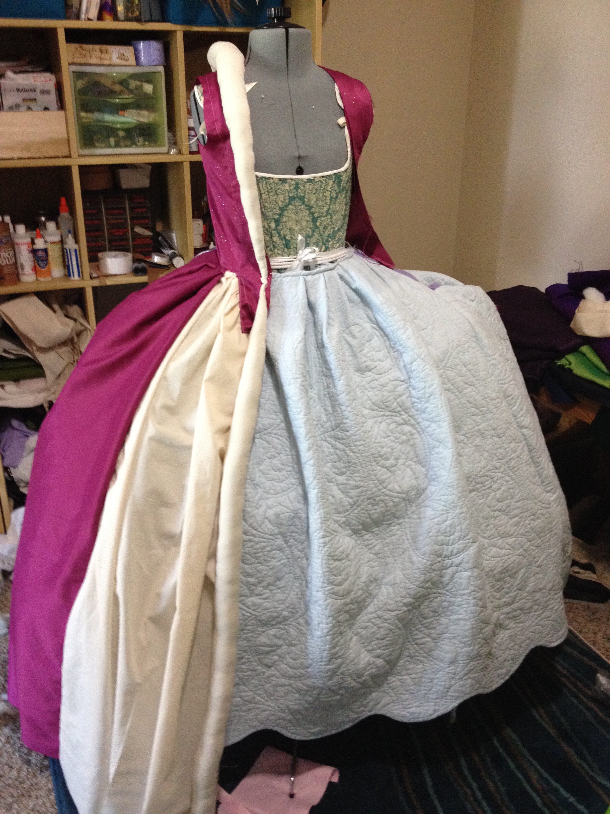Once the undergarments were done, I needed to make petticoats to help hold the shape and pad the dress so that the boning from the panniers didn’t show through. I decided to go with one petticoat- a quilted one- to do this job. I just bought a quilt from ebay for $20, and turned it into a petticoat!