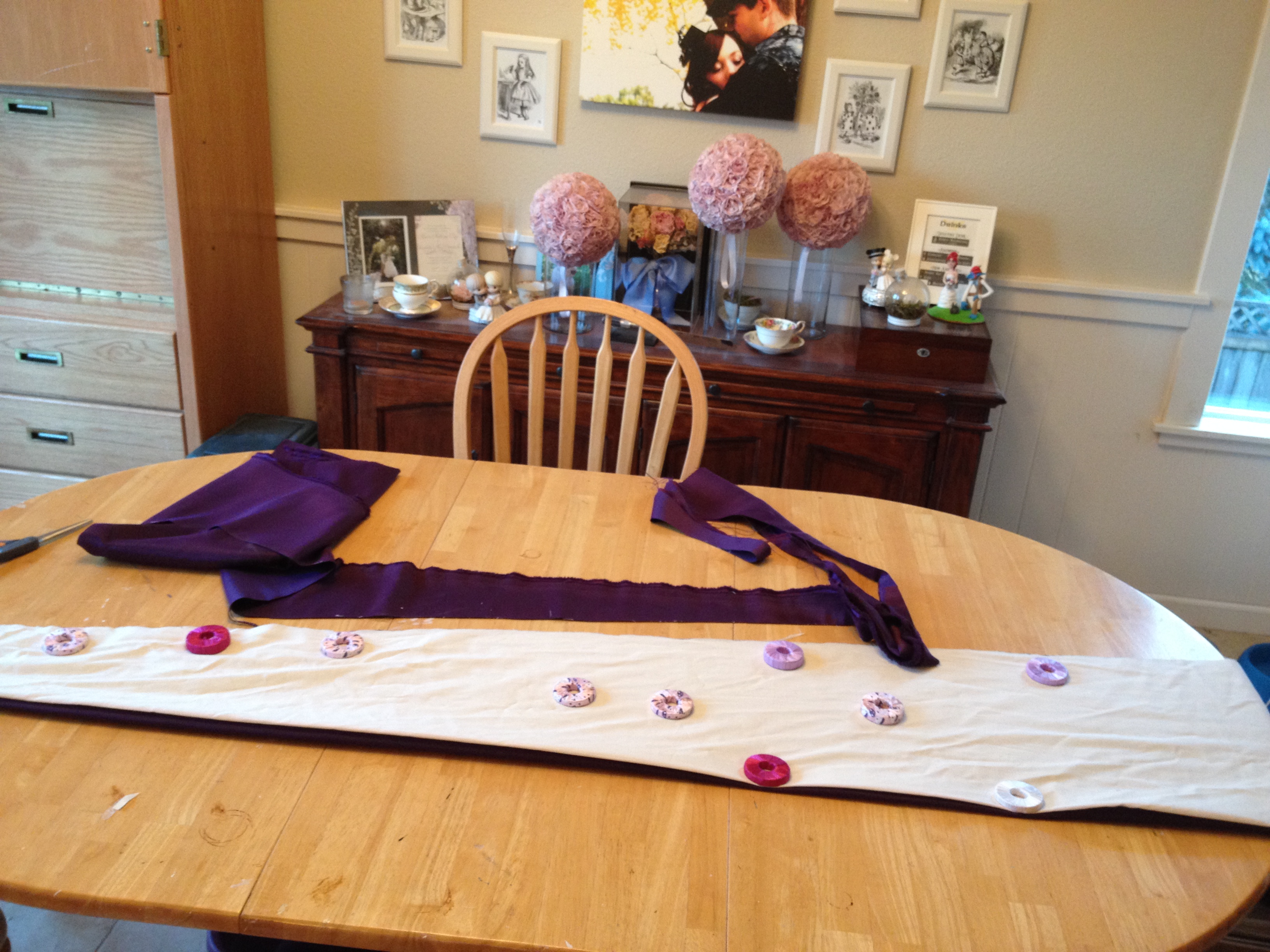 I’m sorry that I don’t have photos of this process, but I’ll try and explain it out. I just pulled the fabric off of the fans and ironed it out for a template to cut out the fabric I ordered. I then spread out the sticks of the fan and spray painted the entire fan purple on both sides, and once that was dry I spread the fan out to sit the way it would when it is opened, with all of the sticks spread evenly. I then lay my cut out fabric over top it, and carefully glued the fabric to each stick, using a long-drying glue that didn’t seep through the fabric and putting some weight on top of the fan so that they would adhere. Once dry, I attached the tassels to the bottom ring, and it was done!