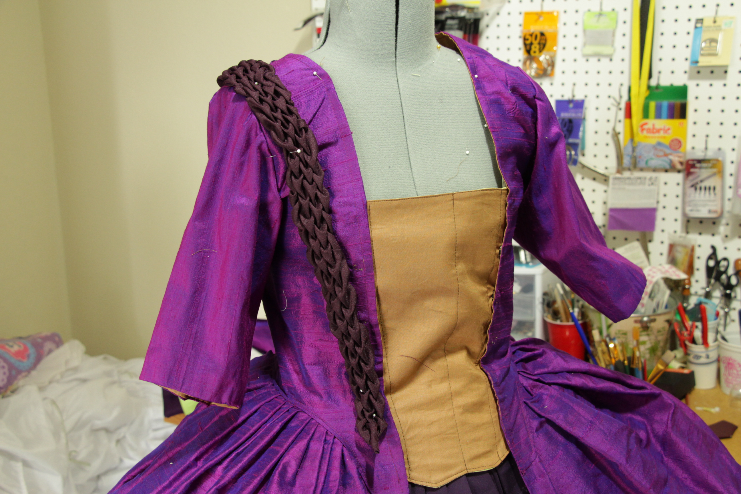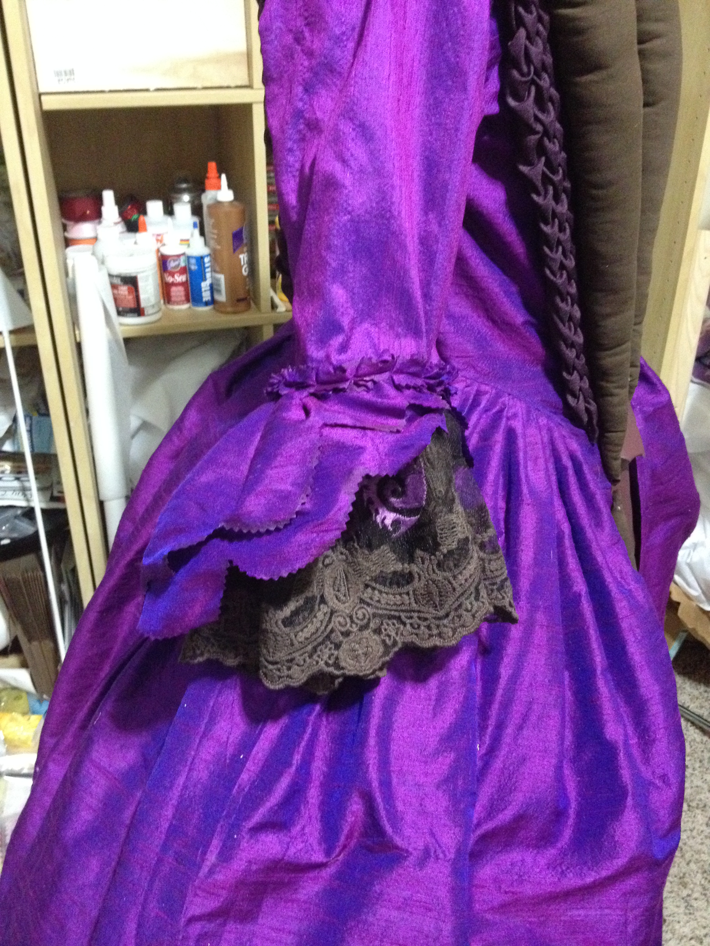 I wanted to put some kind of detail at the top of the sleeve where it attaches to the upper sleeve, so I made some pleated ribbon that I hand sewed to the sleeves.