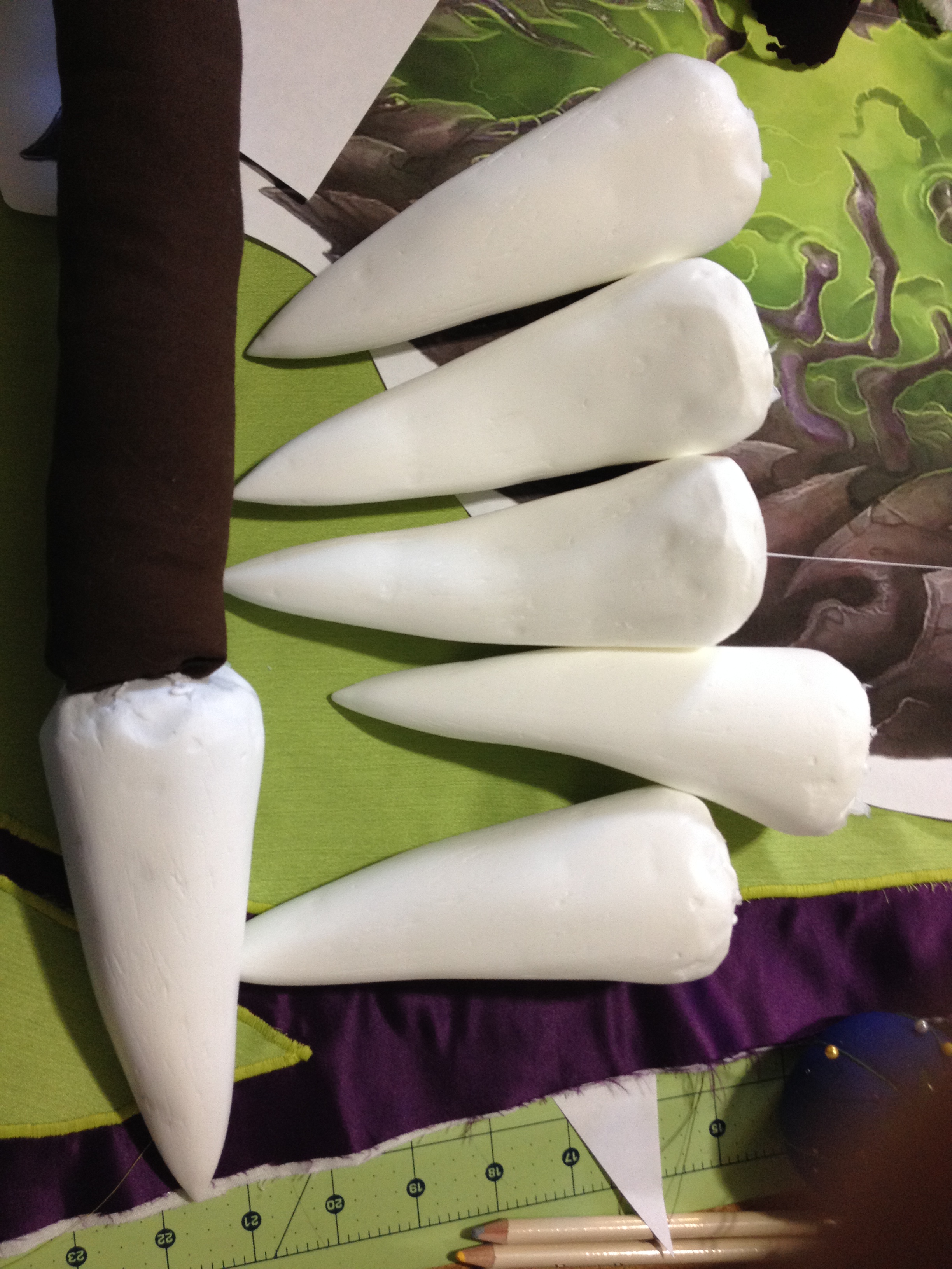 I wanted the spikes on the bottom of the legs to be durable, so I sculpted one out of apoxie sculpt, molded it, and roto cast them in resin (which is good, because them dragging on the concrete outside of BlizzCon did wear them down some). These guys were painted, then hot glued onto the end of the legs.