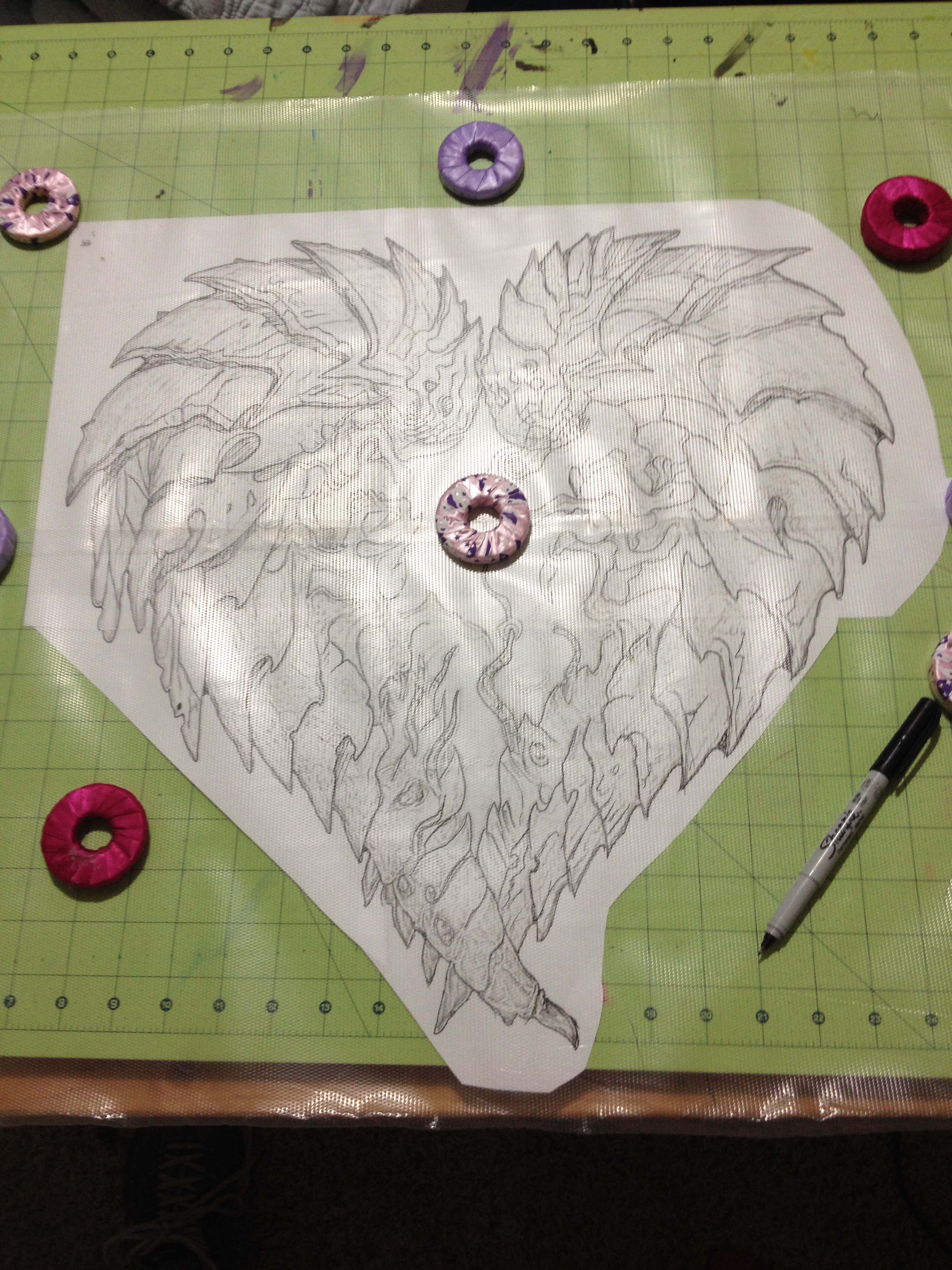 Okay, back to the cape. I wanted some kind of detail to go on the bottom green shape, and I figured this heart Zerg symbol (which I LOVE) would be a perfect fit.