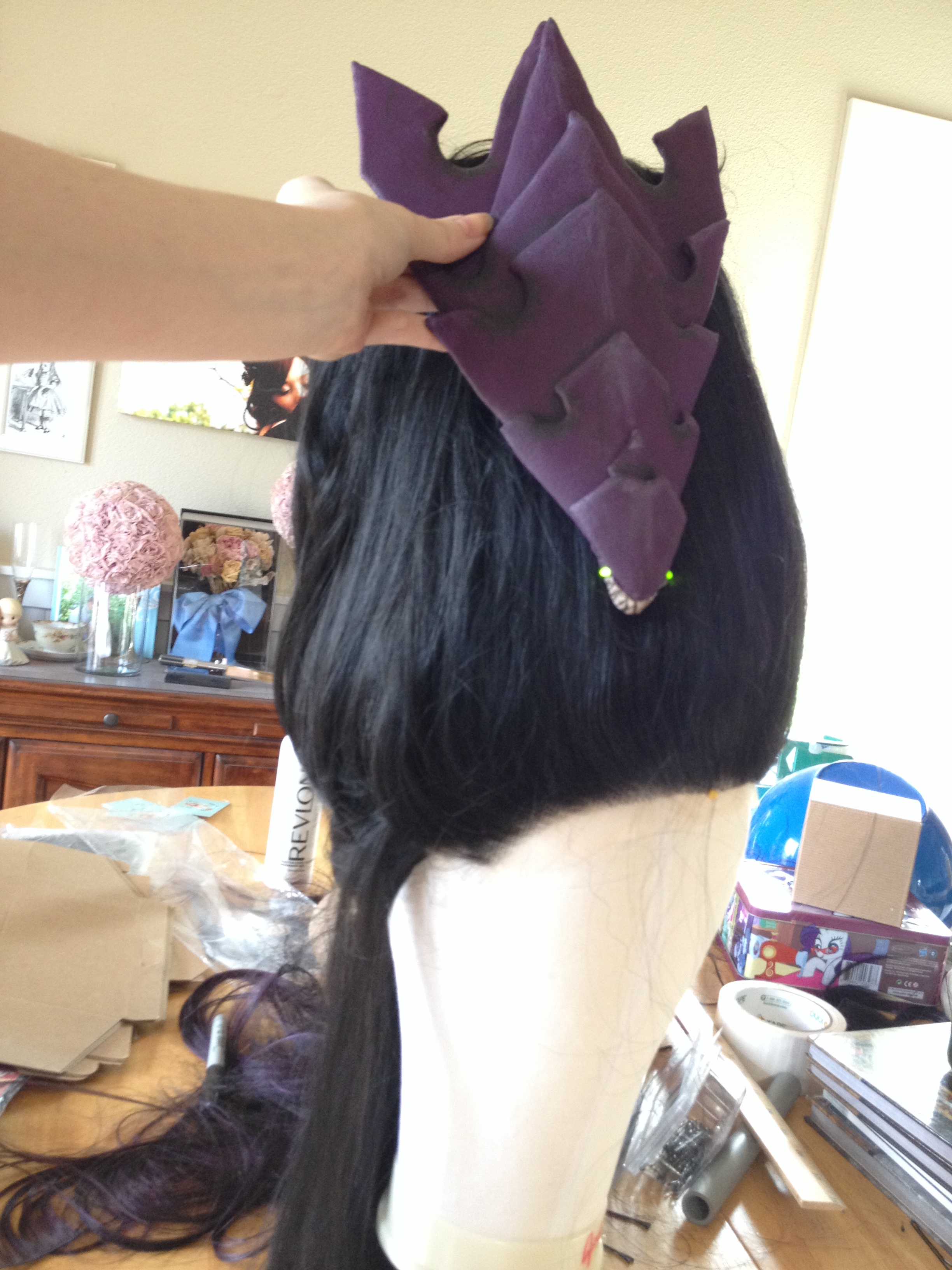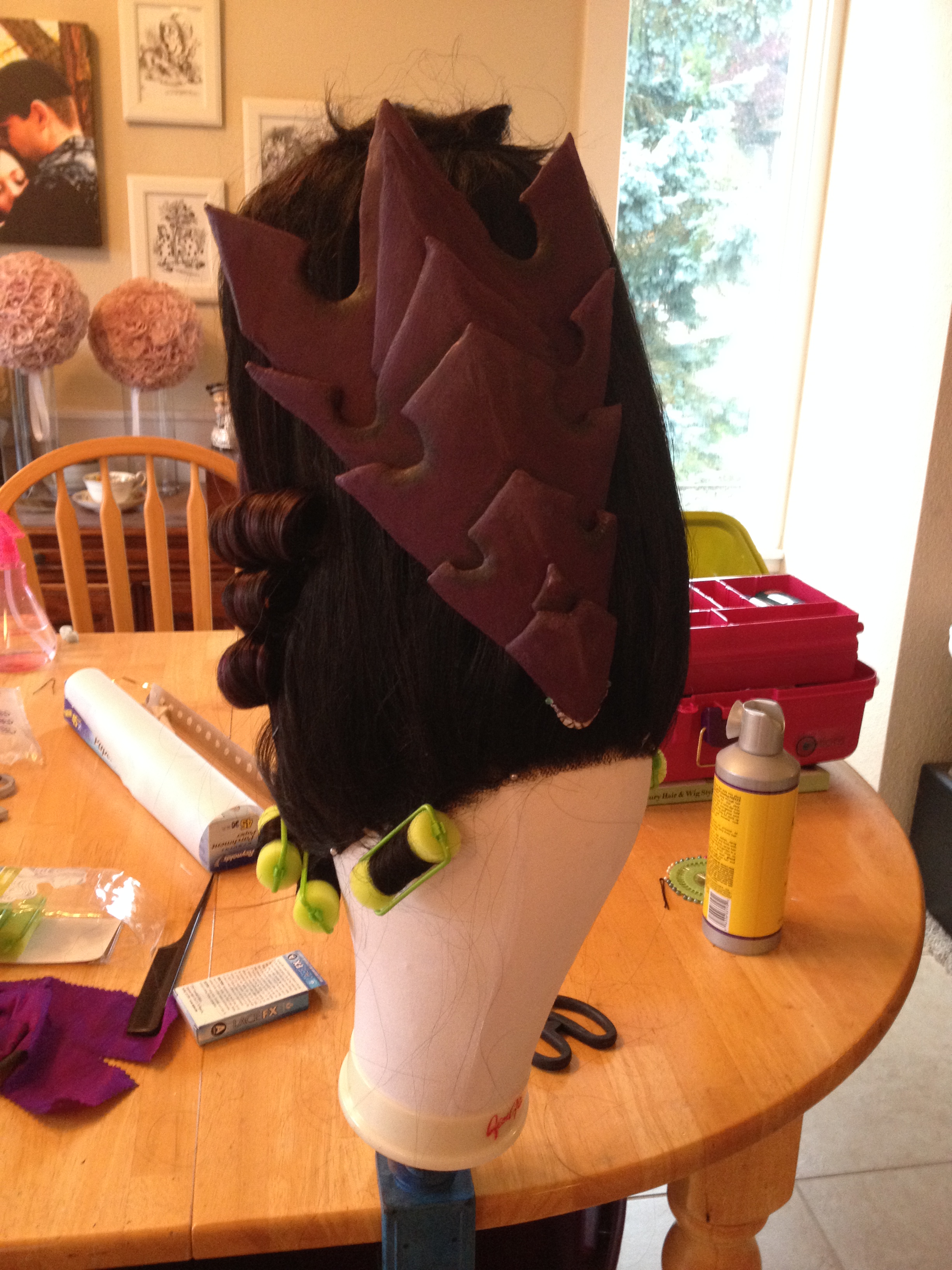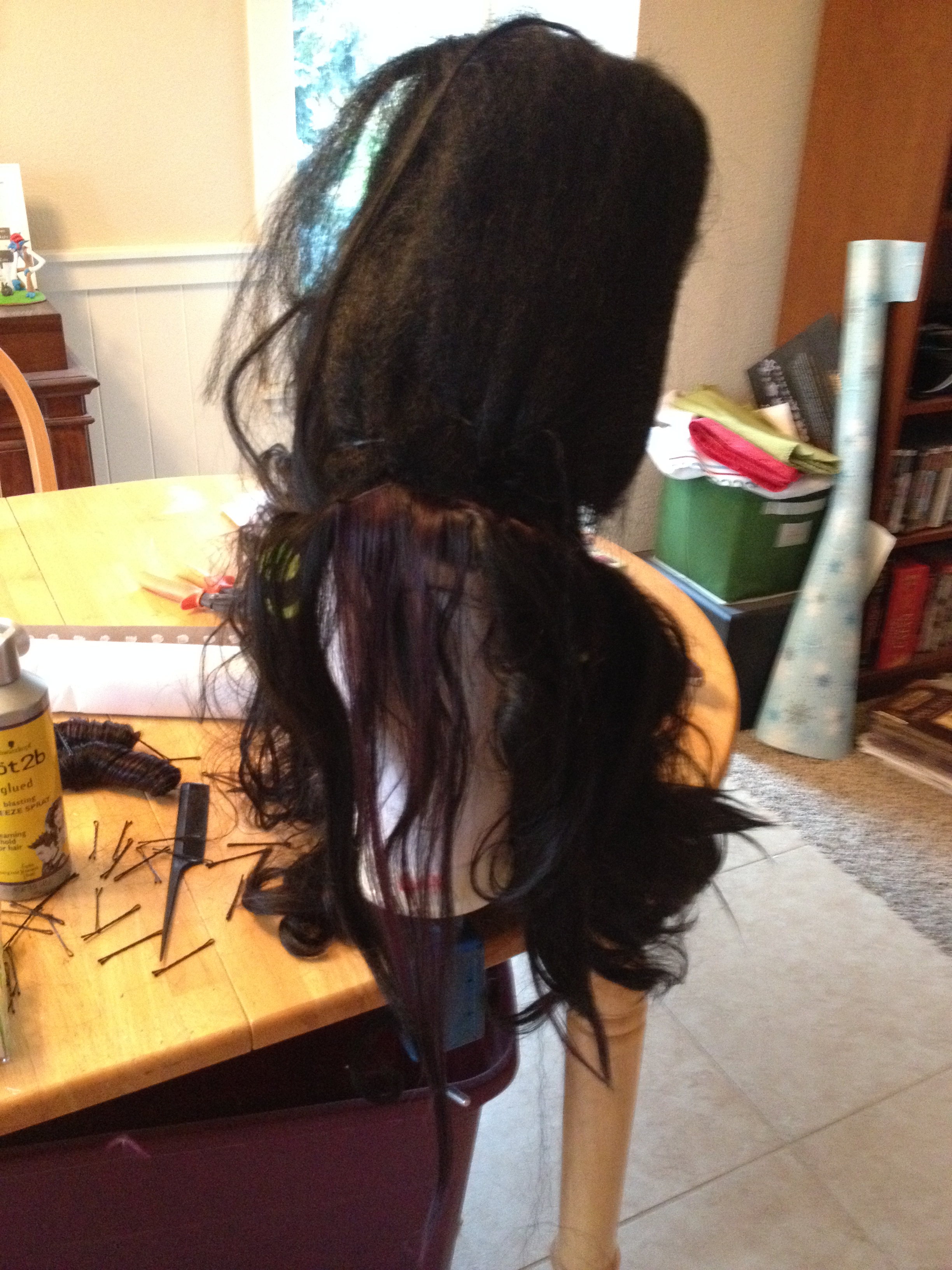 I don’t have photos of the entire process; besides, I followed a tutorial in this book (which is highly, highly recommended). Basically, I started with a Matilda from Arda Wigs in black  because I wanted all of the hair to be up in the front, and a lace front is the best way of getting this result. I straightened the wig with a flat iron before I built a base out of chicken wire (note: pad the bottom of the base where it will be near your head. Ouch.) and added in some dark purple wefts before I started covering the wire base with black loose kankelon hair, held in place with bobby pins.