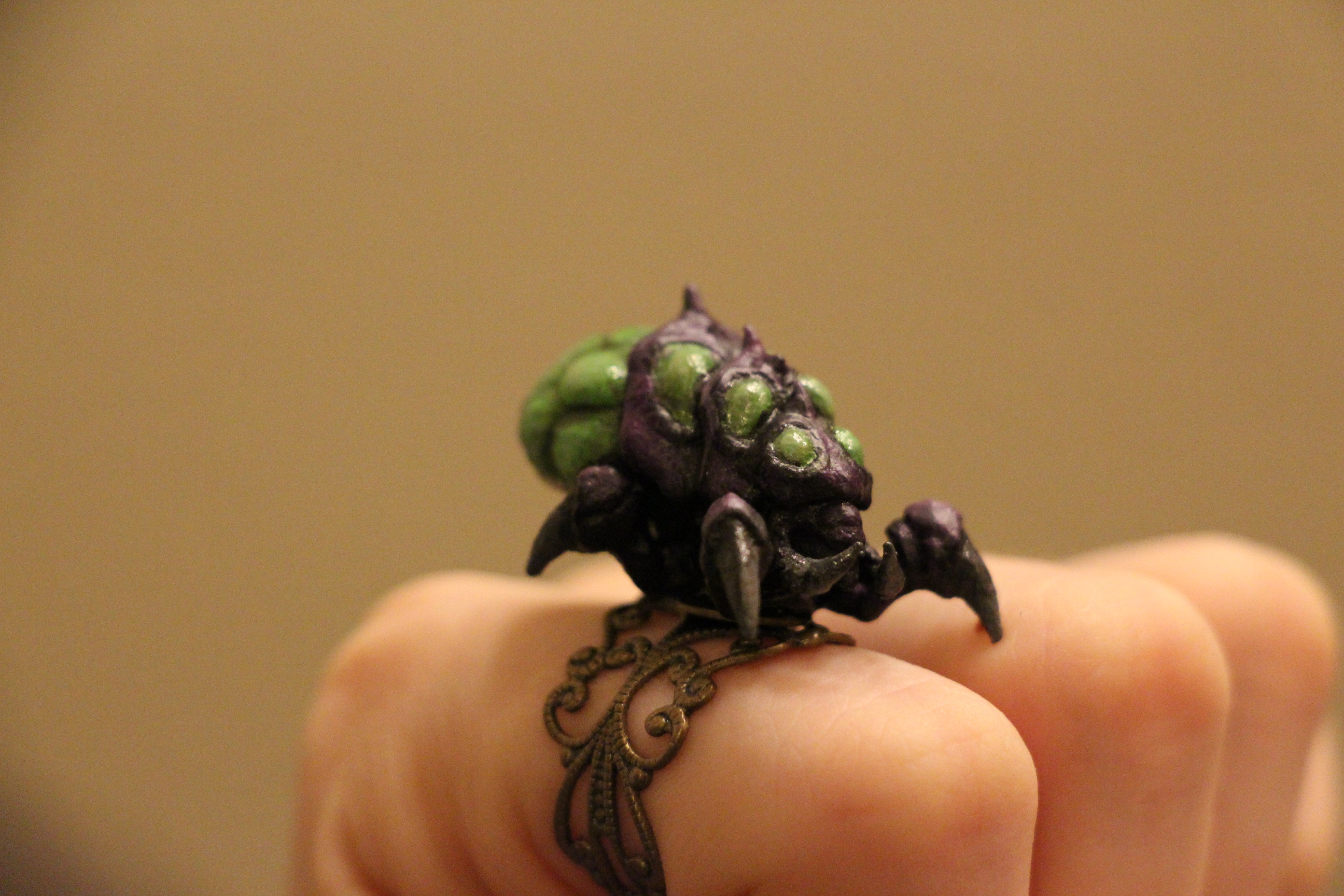 Now, randomly onto my FAVORITE accessory! I wanted huge, amazing ring for this costume, so I got a 3D printed Baneling from Shapeways, and painted it and mounted it onto a ring.