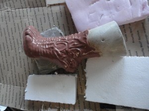 In this post I’m going to discuss the little things that didn’t really have enough content for a post in itself. One of these items are the heels of the shoes. The first thing I did for the feet after we cast the shoe covers in foam latex, is trim the excess foam off, and have Mario make the seams disappear- we’ll cover seaming shortly. Then, I glued the covers to the shoe using the same rubber cement we used to make the paint. After that, I grabbed some two part epoxy clay (we used Magic Sculpt) and sculpted out the heels.