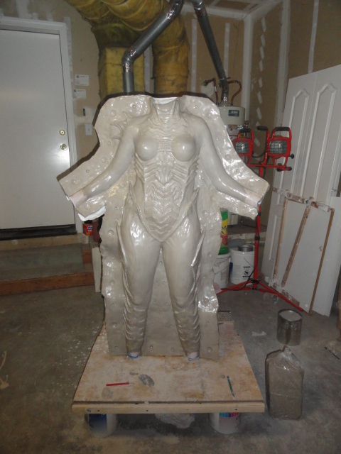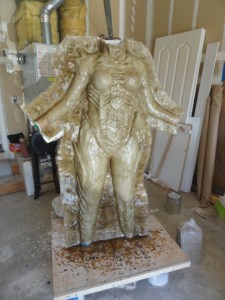 Oh, another important note, when you clean out the clay from the body form, make sure to put it in a bucket, and measure it so that you know the amount of foam latex you’ll need for the suit. Also, work quickly but also take your time with laying the fiberglass, so that there aren’t any air bubbles, or messiness.